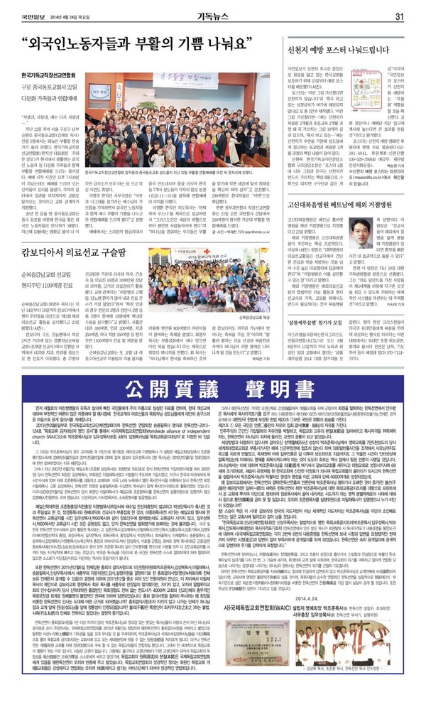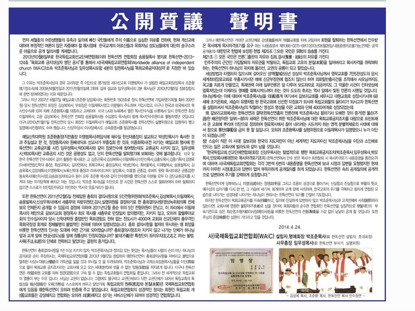 국민일보 31면 8단으로 2014년 4월 24일 발표된 '공개질의 성명서'