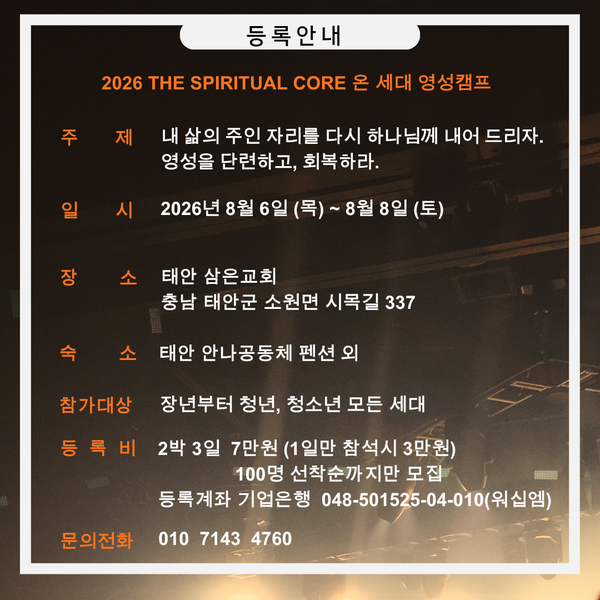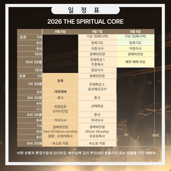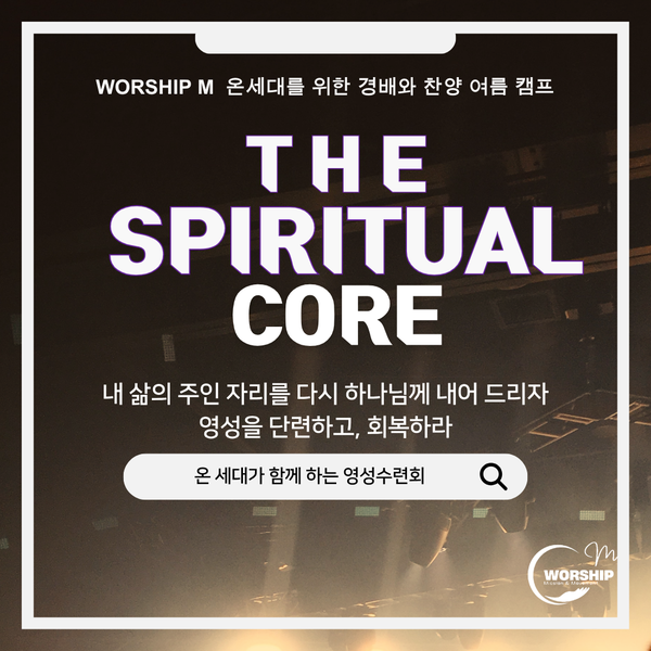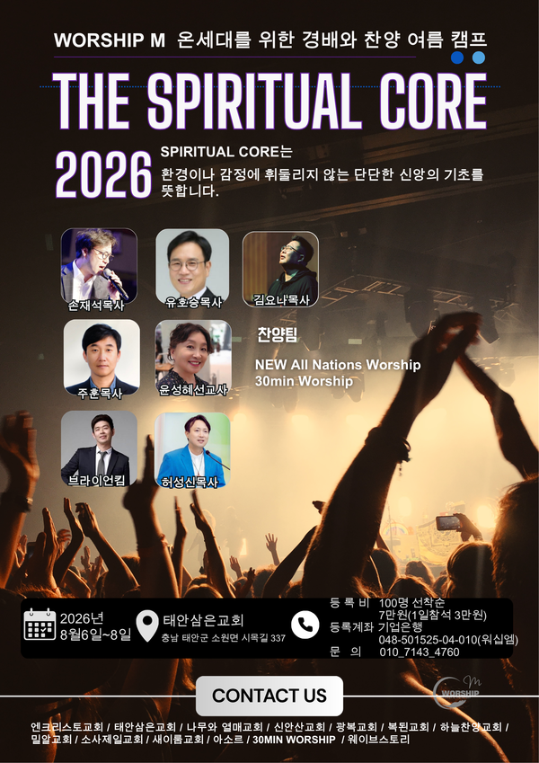 워십엠은 2026년 8월 6일부터 8일까지 2박 3일 동안 태안 삼은교회에서 2026 THE SPIRITUAL CORE 온 세대 영성 캠프를 개최한다고 밝혔습니다. 이번 캠프는 내 삶의 주인 자리를 다시 하나님께 내어 드리자라는 주제 아래 어떤 상황에서도 흔들리지 않는 단단한 신앙의 기초를 다지는 데 목적을 두고 있습니다.