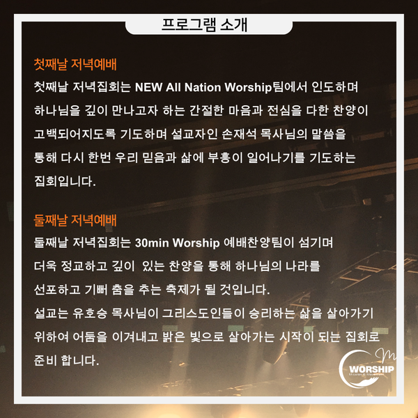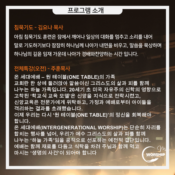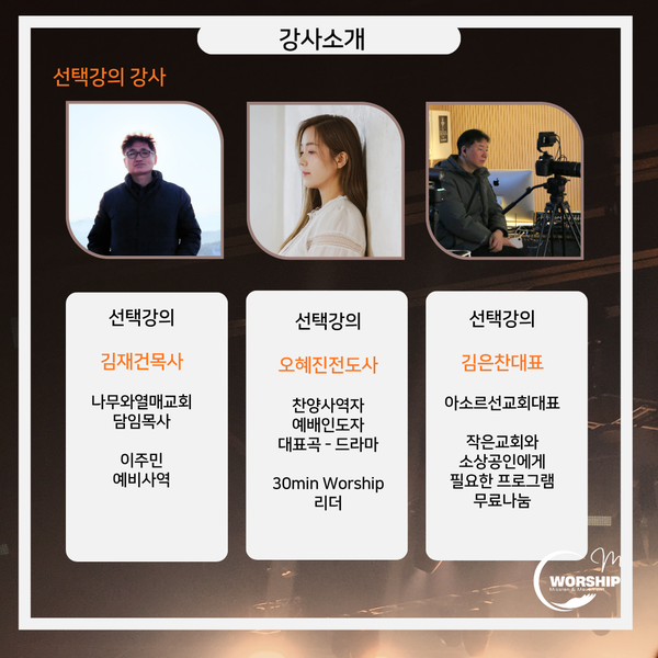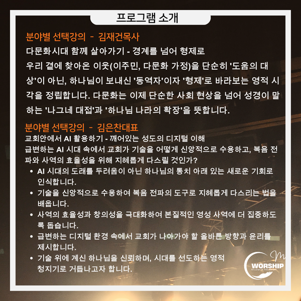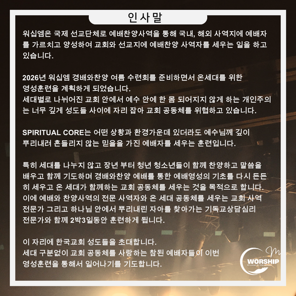 워십엠 관계자는 이번 영성 캠프를 통해 한국 교회 성도들이 세대 구분 없이 다시 일어나 하나님 안에 깊이 뿌리내린 흔들리지 않는 예배자로 세워지기를 기대한다고 전했습니다.