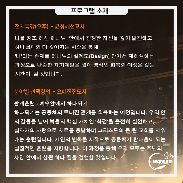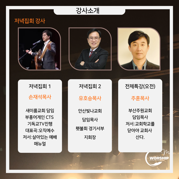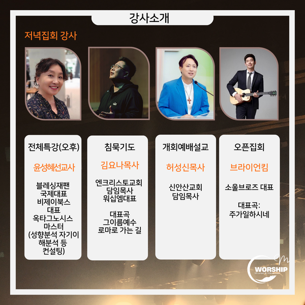 여기에 손재석 목사 유호승 목사 주훈 목사 윤성혜 선교사 등 각 분야의 전문 사역자들이 협력하여 깊이 있는 예배와 강의를 선보입니다. 손재석 목사와 유호승 목사가 인도하는 저녁 부흥 집회는 물론 주훈 목사의 온 세대 예배 특강과 윤성혜 선교사의 영적 회복 강의는 성도들이 하나님 안에서 참된 자아를 발견하고 신앙의 뿌리를 내리는 데 큰 도움을 줄 예정입니다. 또한 오혜진 전도사 김재건 목사 김은찬 대표 등은 선택 강의를 통해 실질적인 관계 훈련과 사역의 지혜를 나눕니다.